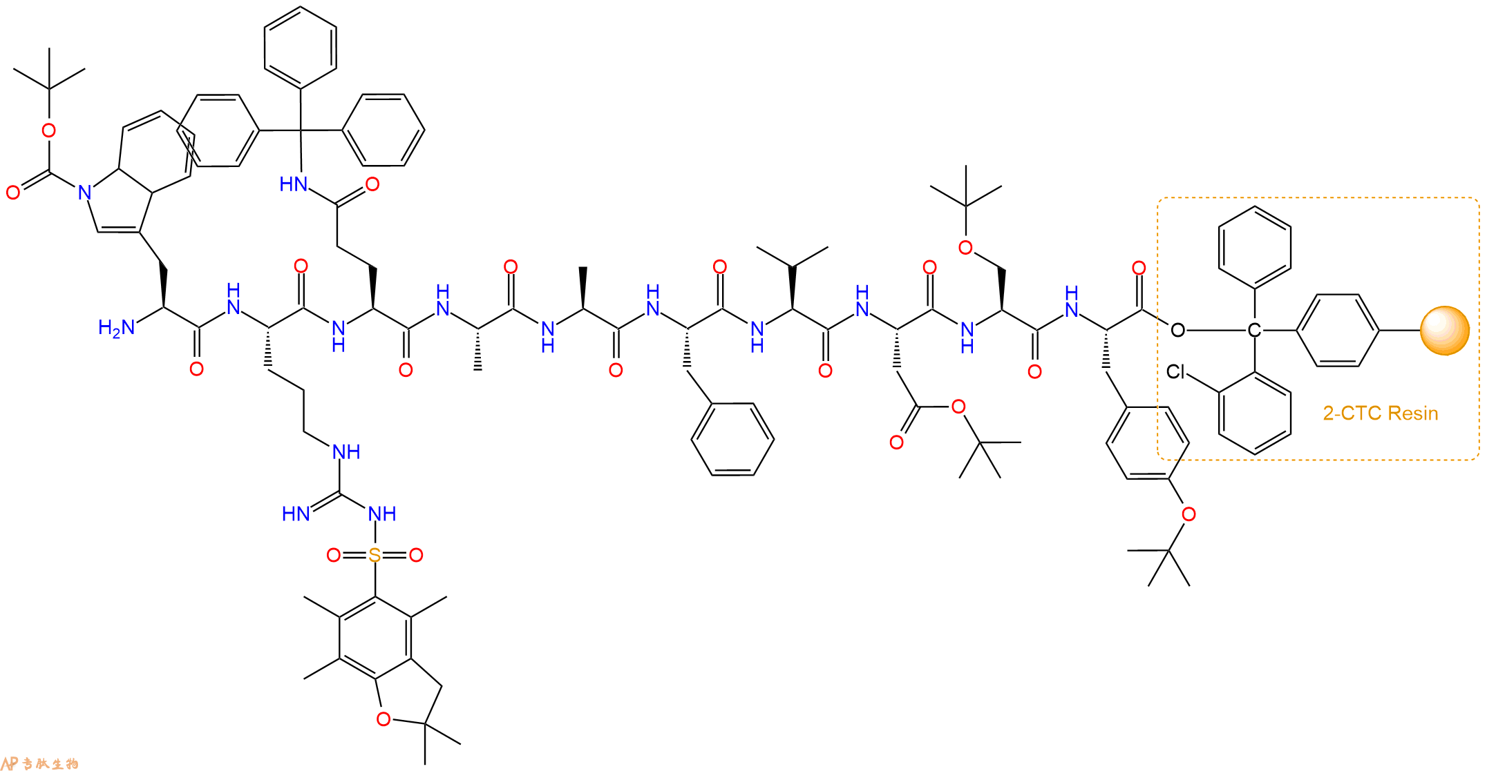 最后再经过步骤二得到 H2N-Trp(Boc)-Arg(Pbf)-Gln(Trt)-Ala-Ala-Phe-Val-Asp(OtBu)-Ser(tBu)-Tyr(tBu)-CTC Resin,结构如下: