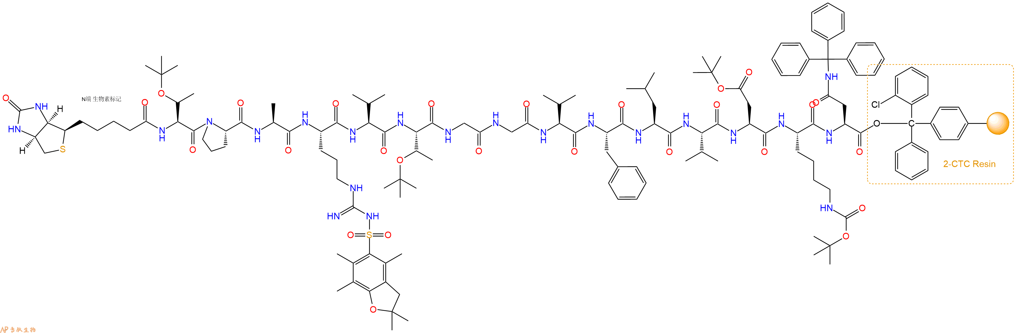 5、生物素反应连接:在上述树脂中,加入适当DMF后,再加入2.37mmol 生物素到树脂中,再加入4.73mmol DIPEA、2.25mmol HBTU,鼓氮气反应30分钟。用2倍树脂体积的DMF 洗涤3次树脂(洗涤树脂,去掉残留溶剂,为下一步反应做准备)。 得到Biotin-Thr(tBu)-Pro-Ala-Arg(Pbf)-Val-Thr(tBu)-Gly-Gly-Val-Phe-Leu-Val-Asp(OtBu)-Lys(Boc)-Asn(Trt)-CTCResin。 结构如下: