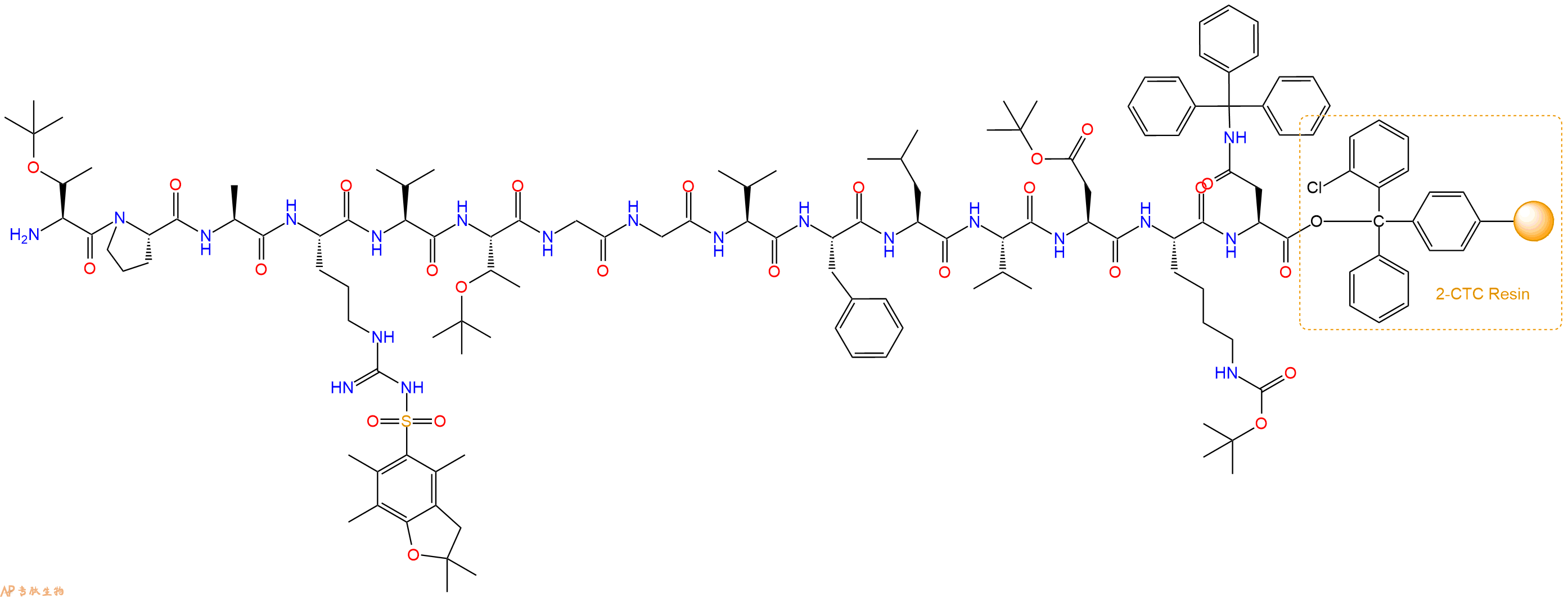 最后再经过步骤二得到 H2N-Thr(tBu)-Pro-Ala-Arg(Pbf)-Val-Thr(tBu)-Gly-Gly-Val-Phe-Leu-Val-Asp(OtBu)-Lys(Boc)-Asn(Trt)-CTC Resin,结构如下: