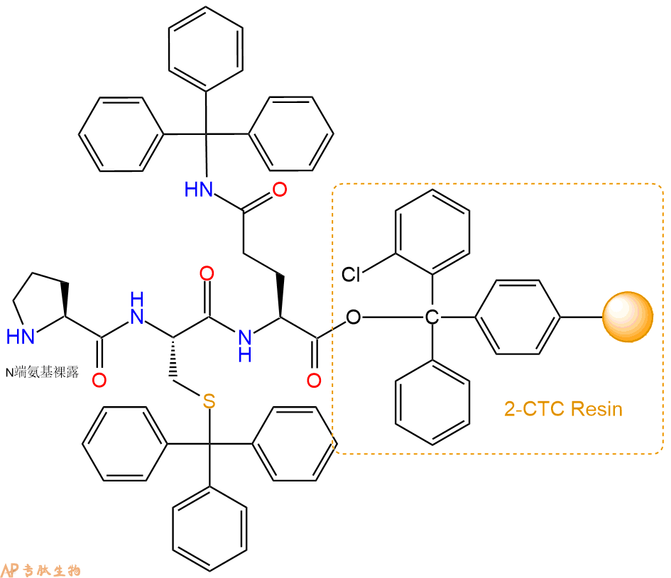 最后再经过步骤二得到 H2N-Pro-Cys(Trt)-Gln(Trt)-CTC Resin,结构如下: